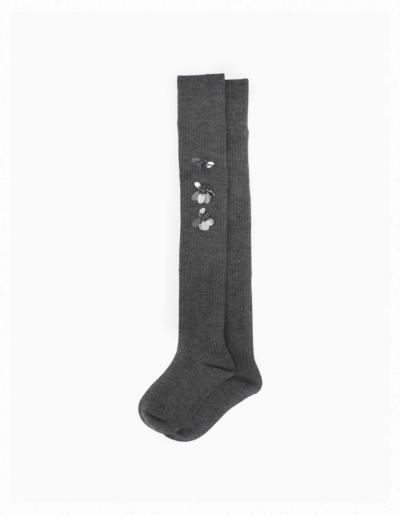 High socks with a special feel, luxuriously decorated with bijoux. Adding a sparkle to your feet will instantly add a touch of color to your simple styling. The charming design of different bejoux designs for each color is attractive, with the elegant three-strand arrangement of the gray gives it a classic impression, while the brown creates a randomly scattered design that creates a feminine atmosphere. The exquisite length up to the knees goes well with a wide range of shoes, including loafers, pumps, and boots. From daily wear to special occasions, this pair of shoes will elevate your style from the feet.