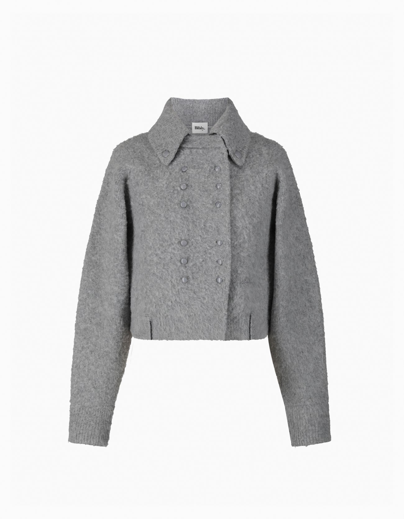 A cardigan with a classic mood, made of luxuriously soft mohair material. The fluffy texture gives a gentle impression, while the compact length will enhance your style. On the front, two rows of small buttons add an elegant accent. With a subtle belt loop design at the waist and star studs on the back style, every detail has been perfected. The Bibiy. embroidery on the left hip creates a subtle yet special feel that is typical of the brand. This is a piece that stands out in terms of femininity and elegance just by putting it on.