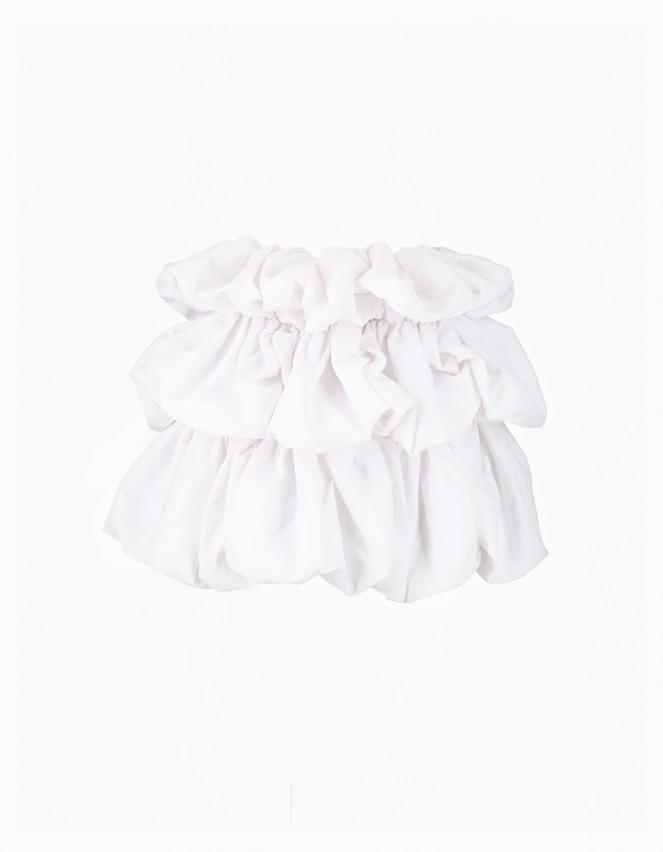 A balloon skirt with a strong presence with a fresh, fluffy silhouette that catches your eye. The frills have a soft, three-dimensional look, and have a rounded shape that looks like a balloon, adding a light and gorgeous look every time you move. The ruffles vary in length to create a step, adding depth and movement to your expression. This piece has a design that exudes a modern nuance in its sweetness, making it a piece that will be the main focus of your outfit.