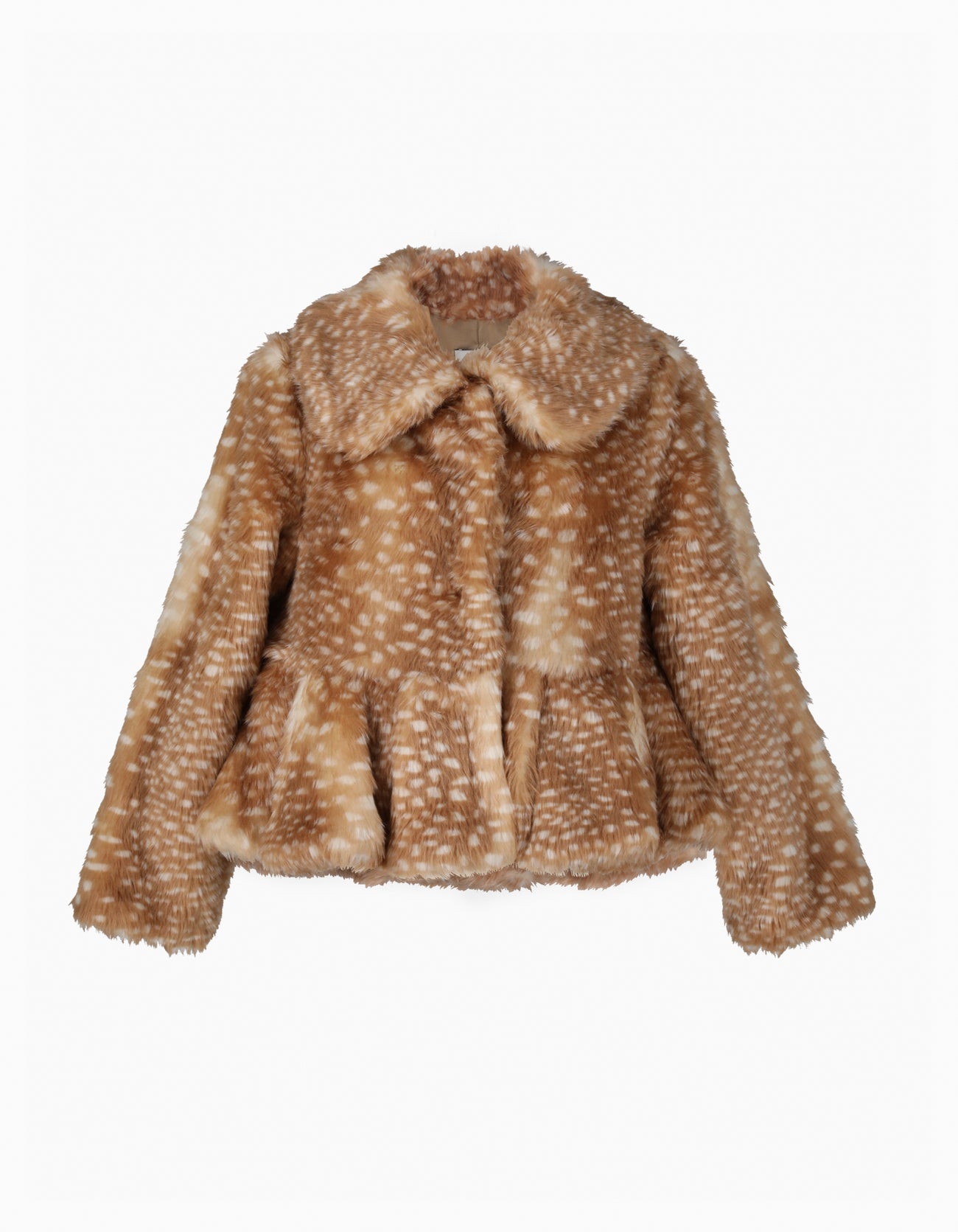 A peplum fur coat with a collar typical of Bibiy. We have upgraded the peplum design fur coat that has been popular in the past.The peplum is luxuriously added to accentuate the voluminous and three-dimensional feel of this gorgeous silhouette. Available in two types: elegant beige fur with delicate borders and thick, plump Bambi pattern fur. The large, rounded collar creates a soft, feminine look, and the meticulous attention to detail in materials and design creates a sophisticated style.