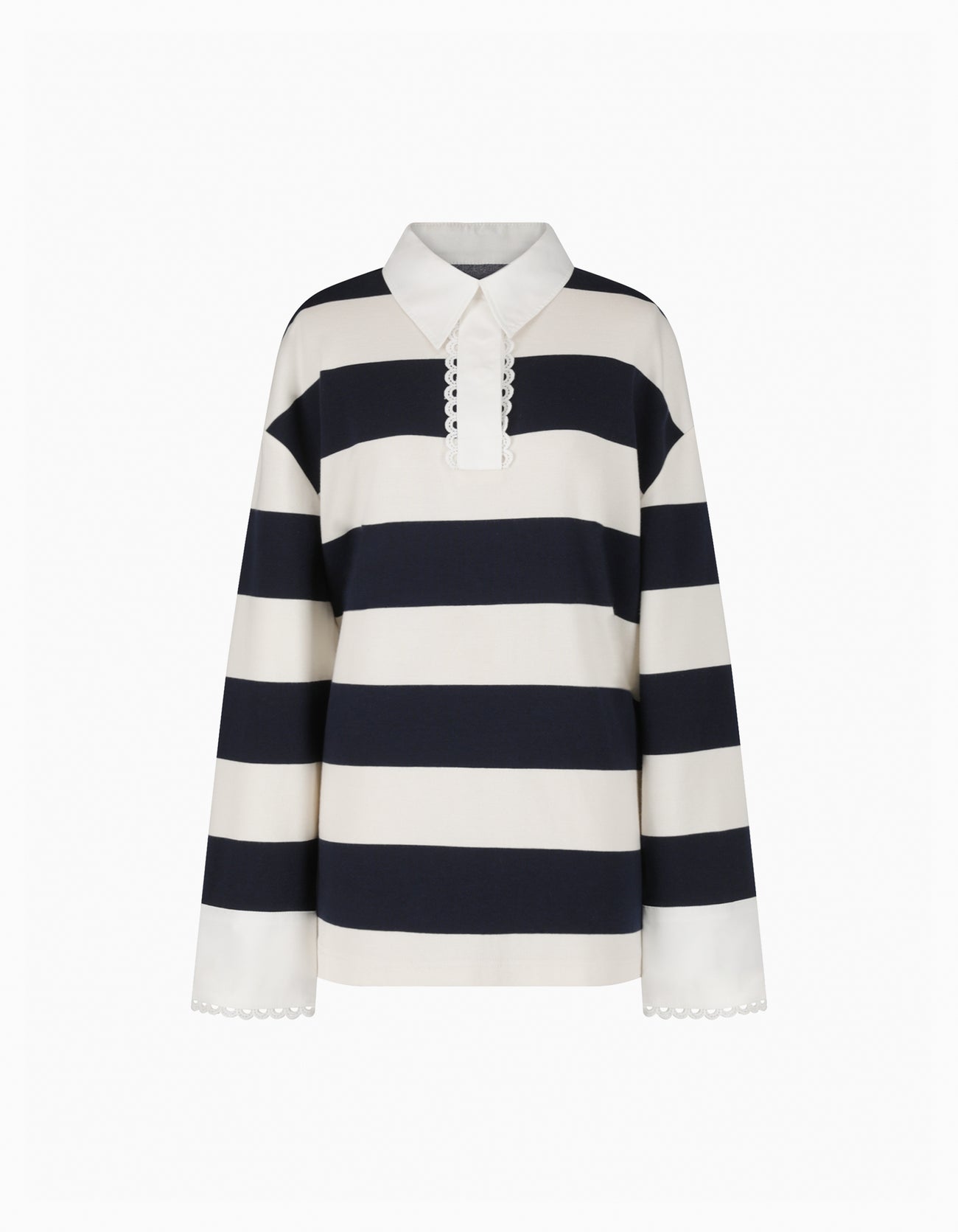 A rugby shirt with delicate pico lace on the collar and sleeves, exquisitely combining sweetness and sportiness. The impressive, large two-tone border accents, adding a touch of glamour to your style. Made from high-quality fabric that is thick yet comfortable to wear, it is comfortable to wear. The oversized silhouette is worn loosely, creating a sophisticated and relaxed look. The exquisite balance with the crisp coloring creates a luxurious style for adults. The cuffs are embroidered with Bibiy. to casually add the brand's personality.