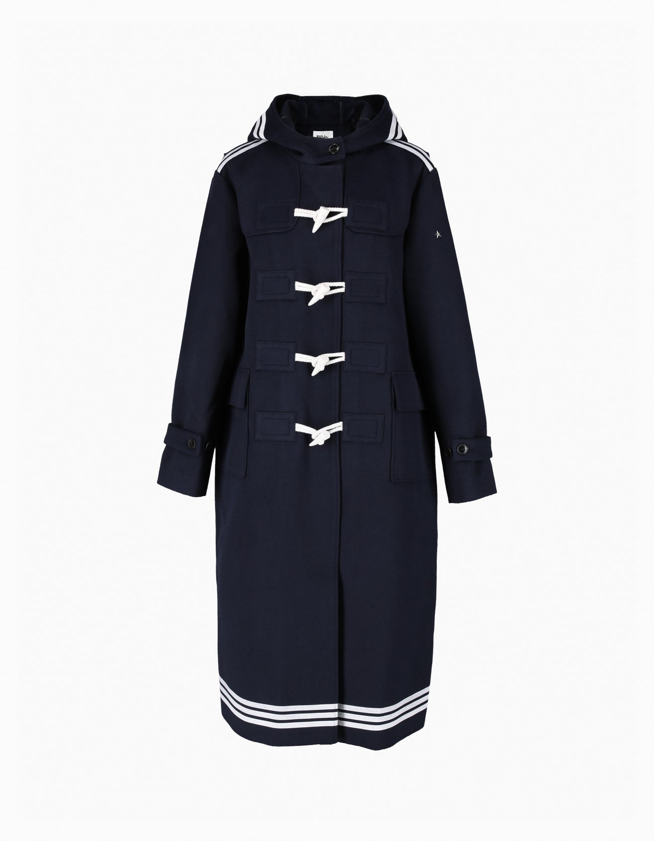 화사한 컬러 라인이 돋보이는 스쿨 스타일의 더플코트입니다. 절묘한 라인 포지셔닝은 물론, 입체적인 후드와 클래식한 더플 버튼, 왼쪽 어깨의 별 모양 리벳 등 디테일까지 신경 쓴 작품입니다. 젠더리스 디자인과 딱 맞는 오버사이즈 실루엣으로 남성적인 매력을 돋보이게 하며 스타일링의 폭을 넓혀줍니다. 견고한 질감과 고급스러운 테일러링으로 아우터로서의 존재감과 품격을 모두 갖춘 아이템입니다.