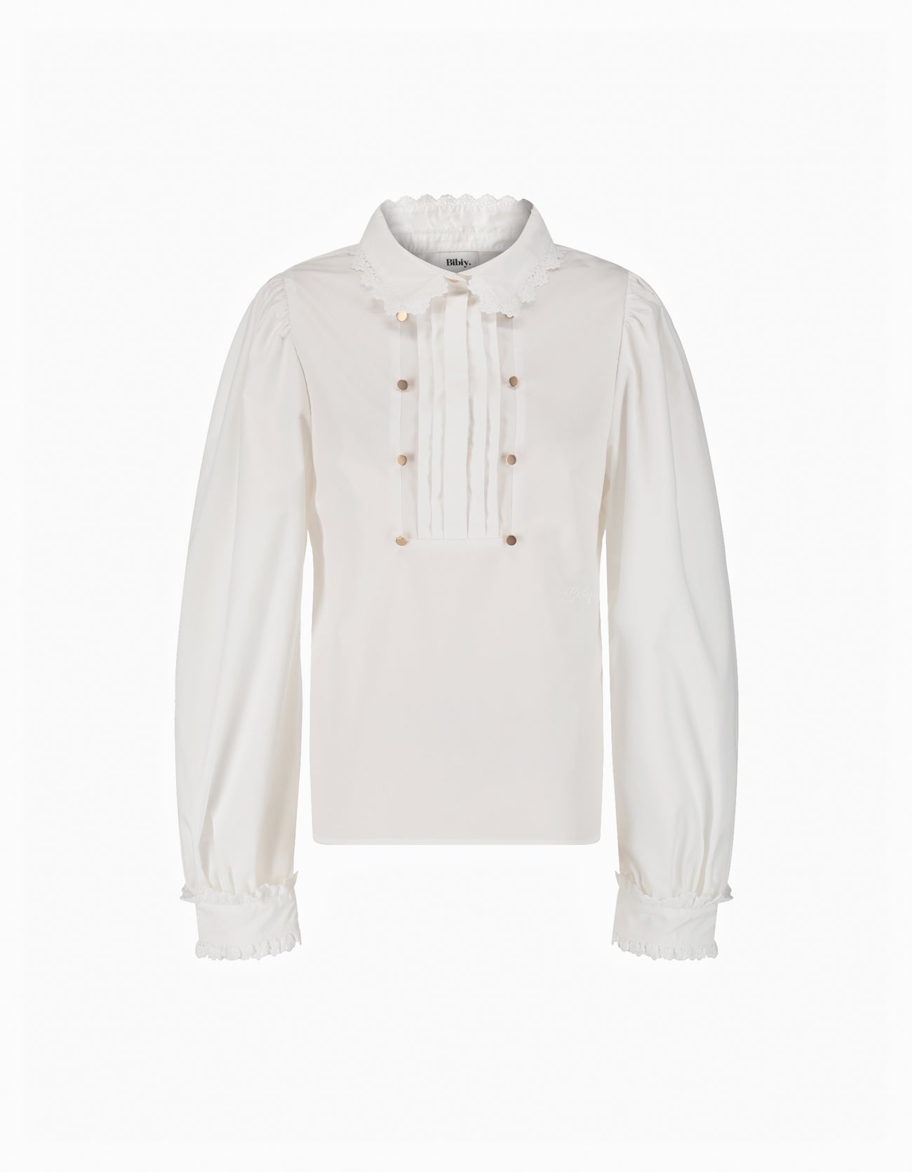 우아한 악센트로 중앙 전면에 작은 금 버튼이있는 블라우스. 바삭 바삭하고 단단한 직물로 만들어진 실루엣을 아름답게 유지합니다. 골드 버튼은 상단을 제외한 더미 디자인이며 전면 개구부는 끈 버튼입니다. 앞면은 섬세한 핀 턱으로 장식되어 우아한 모양을 더합니다. 칼라와 커프는 피코 레이스로 장식되어 있으며 커프의 피코 레이스는 모여 화려한 모양을 만듭니다. 이것은 세부 사항에주의를 기울여 간단하지만 신중하게 선택된 아름답고 정교한 블라우스입니다.