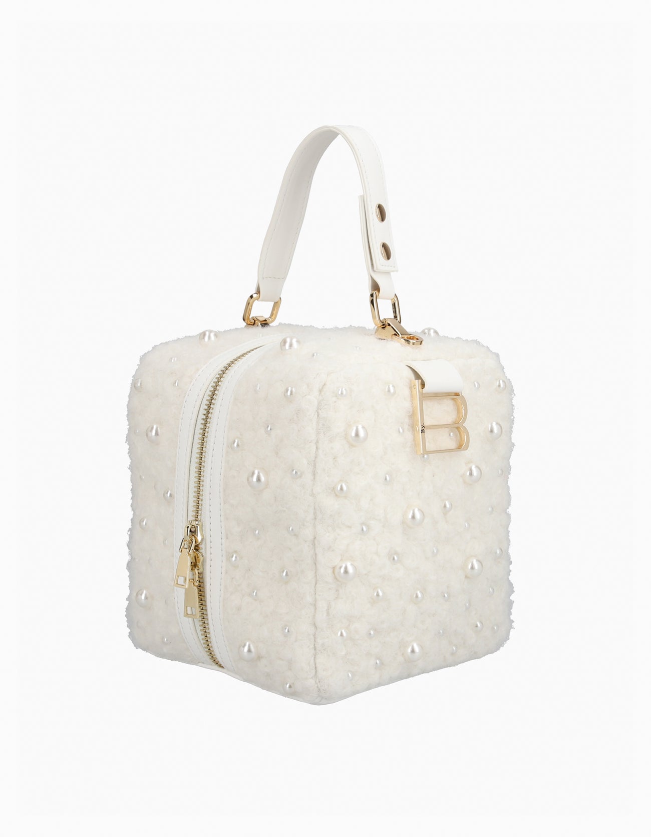 B. BOX BAGシリーズに新デザインが登場。羊の毛のようなウールライク素材にパールをランダムにビス打ちしたスペシャルな仕上がりで、華やかさと存在感をプラス。リッチな起毛感でぬくもりのある生地に、繊細な煌めきを放つパールを散りばめたホリデーシーズンの装いにもぴったりな、Bibiy.らしいエレガンスが詰まったアイコンバッグです。