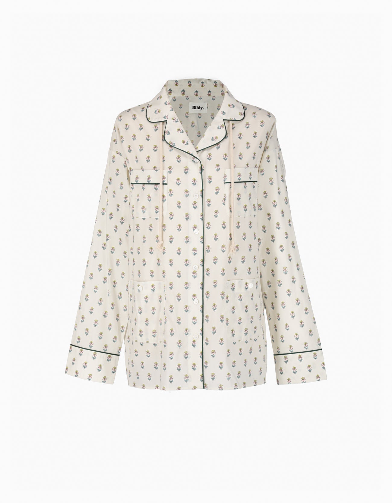 「ルームウェアを日常に」をコンセプトに仕立てた特別なアイテム。ルームウェアらしいパイピングや前あき、衿のデザイン、ストレスフリーな着心地はそのままに、デイリーに着られるデザインを追求しました。生地の柄やパイピングカラー、細やかなパーツのディテールまでこだわり、衿から伸びる紐など、さりげないアクセントもプラス。リラックス感を保ちながらも、かっちりめのアイテムと組み合わせることで、緩すぎない上品な大人のスタイリングが楽しめる一着です。