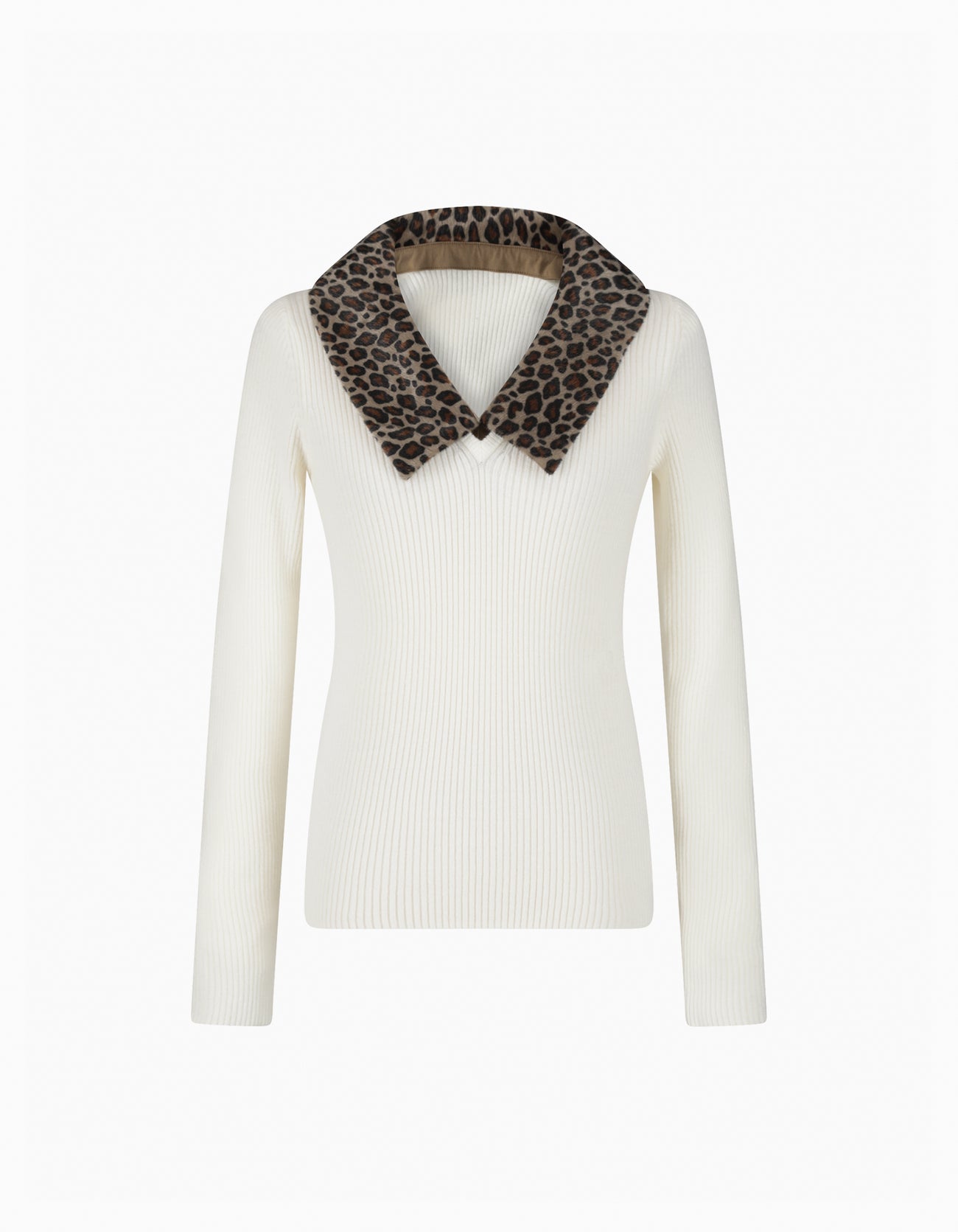 ハラコ素材のレオパード襟が印象的なニット。もっちりとした上質な糸で編まれたニット素材は、柔らかく肌触りの良い着心地を実現。身体のラインを美しく見せるリブ編みで、すっきりと美しいシルエットに仕上げています。胸元は程よくVネックにデザインし、自然な抜け感を演出。襟はスナップボタンで簡単に取り外し可能で、シーンや気分に応じてノーマルニットとしても楽しめます。腰元の立体的なBロゴがさりげないアクセントとなり、上品な存在感をプラス。ハラコ素材とニットの組み合わせは珍しく、着こなしに個性とラグジュアリー感を添えてくれる一枚です。