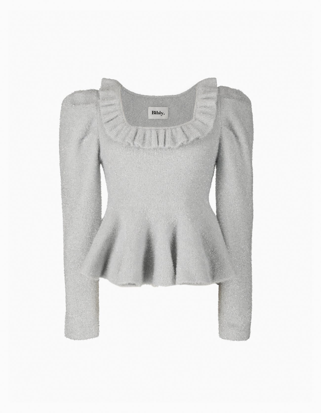ラメ糸を織り交ぜた艶やかな編地が、上品な華やかさを纏うペプラムニット。ネックラインと裾にたっぷりと施されたフリルが生み出す立体的なシルエットが、動きに表情を添えます。スクエアネックのすっきりとした開きが甘さを程よく引き締め、顔まわりを美しく見せてくれる一枚に。角が立つよう設計された構築的なパフスリーブがエレガントに映える、ディテールにこだわったデザインです。一枚でスタイルが完成する、Bibiy.ならではのエッジィなフェミニンスタイルをお楽しみください。