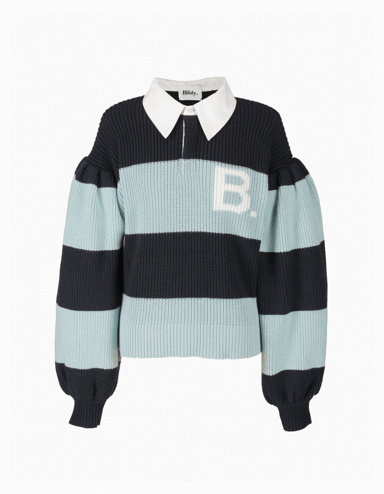 ラガーシャツのディテールをニットで表現した一着。ざっくりとした編み地のオーバーサイズシルエットに、パフスリーブと短めの丈で女性らしさをプラスしました。B.ロゴは高級感のあるインターシャ編みで仕上げ、立体感のあるニットに布帛をドッキング。異素材を組み合わせた高度な仕様ながら、カジュアルとフォーマルの絶妙なバランスを追求しました。前立て裏の白いシャツ生地がアクセントになり、ハーフボタンを開けることで遊び心あるスタイリングも楽しめる、Bibiy.らしいこだわりが詰まった一着。