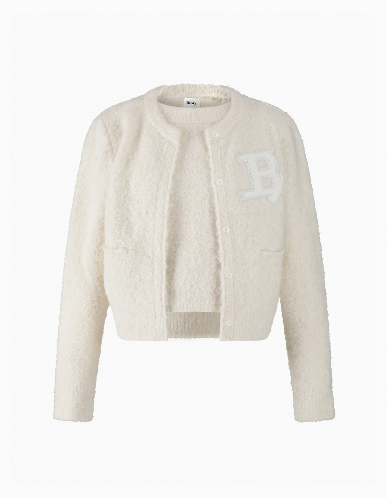まるでカーディガンを重ねたようなレイヤード見えが魅力のニット。使用しているループヤーンは、異なる糸を巧みにねじり合わせることで、深みのある色合いと立体的なテクスチャーを演出。中のノースリーブニットとカーディガン部分は一体化した設計で、レイヤードスタイルを手軽に楽しめます。柔らかい肩パッドを仕込み、肩のラインを美しく立体的に整えた、洗練されたシルエットもポイントです。オリジナルアップリケがさりげないアクセントとなり、前立てボタンはダミー仕様で細部までこだわり抜いたデザイン。一枚でコーディネートをワンランクアップさせる上質でラグジュアリーなトップスです。